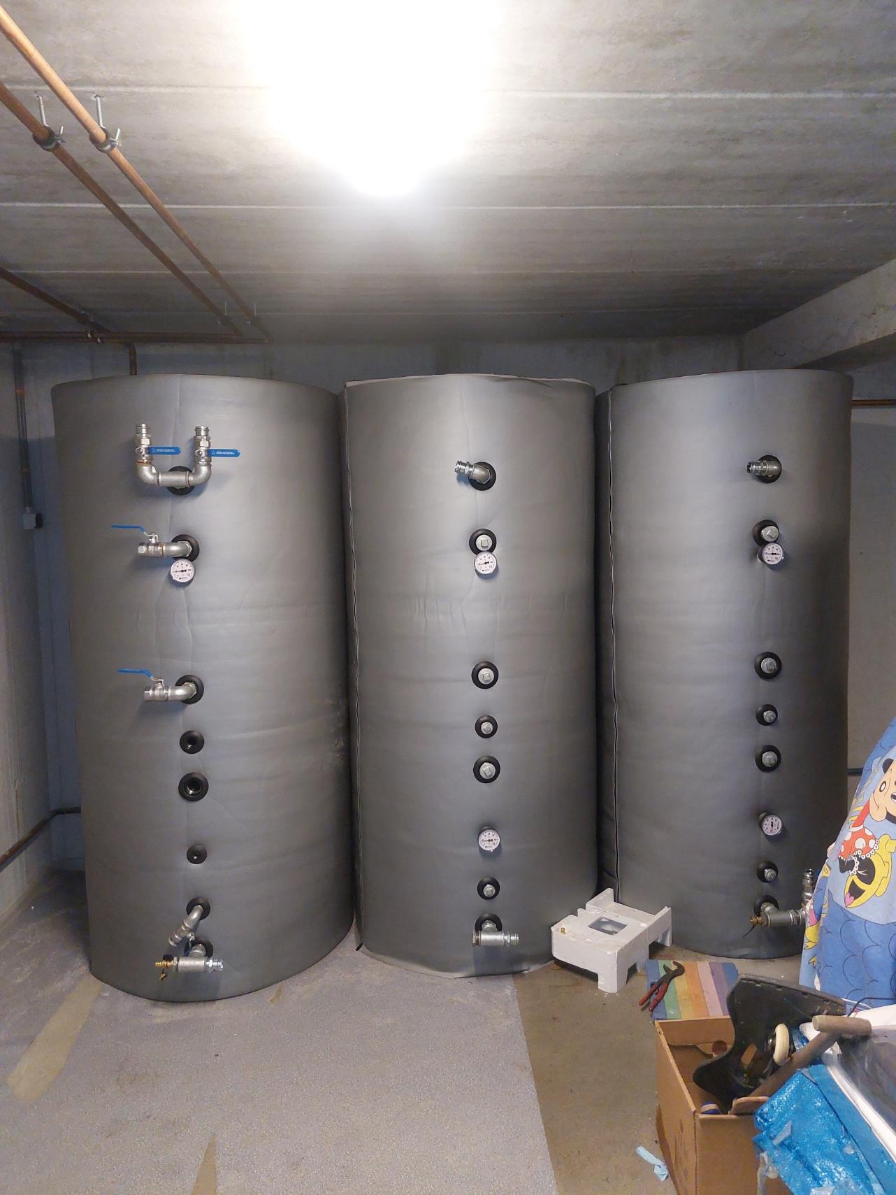 Het is heel sterk aan te raden om ook een buffervat te installeren voor de opslag van de warmte. Voor een ketel van 15 kW, een buffervat van 800 liter, voor een ketel van 25 kW is een buffervat van 1000 liter nodig De houtketel gaat nu met 100 % capaciteit branden tot het water in het buffervat 85°C bereikt heeft. Vanaf dan mag de ketel stoppen met branden, want nu heeft men heel veel warmte opgeslagen in het buffervat. De warmtekringen nemen nu hun warmte niet meer rechtstreeks af van de ketel , maar van het buffervat.